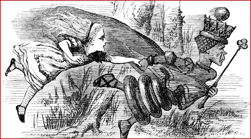 Alice demande alors : « On arriverait généralement à un autre endroit si on courait très vite pendant longtemps, comme nous venons de le faire. »