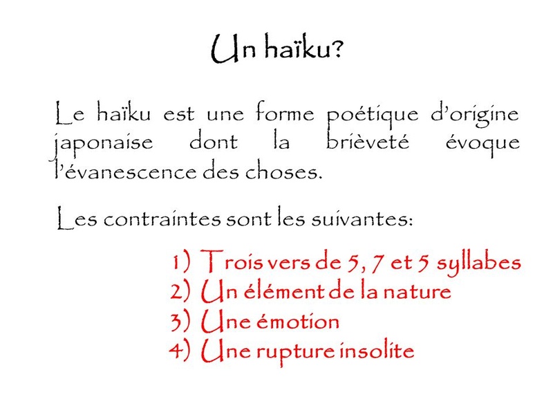 Un haïku évoque généralement une saison (le kigo) et doit comporter une césure (le kireji).