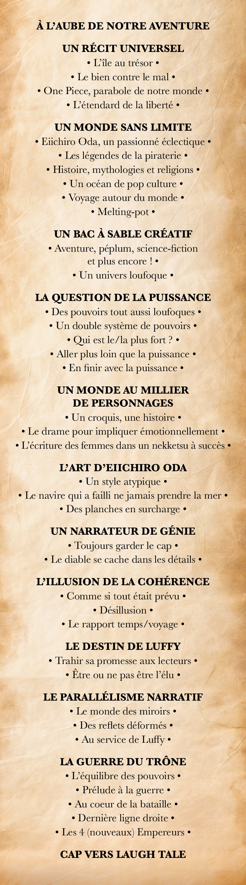 Ensemble, nous découvrirons comment Eiichiro Oda s’est imposé en tant qu’extraordinaire conteur d’histoires en façonnant un récit original et universel qui nous tient en haleine depuis presque 30 ans.Nous naviguerons dans ce monde, véritable parabole du nôtre, grâce auquel le mangaka s’autorise une grande liberté de création et où se croisent histoire, littérature, arts, mythes et culture populaire.